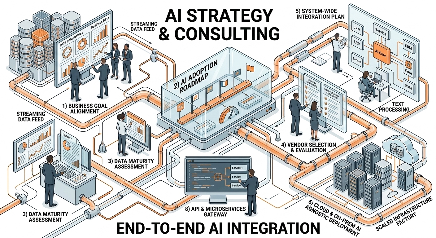 AI strategy consulting is a professional service that helps organizations identify, plan, and implement artificial intelligence initiatives aligned with their business objectives. A qualified AI strategy consultant assesses your data assets, technology infrastructure, and operational workflows to design a structured roadmap for AI adoption that maximizes ROI and minimizes implementation risk.