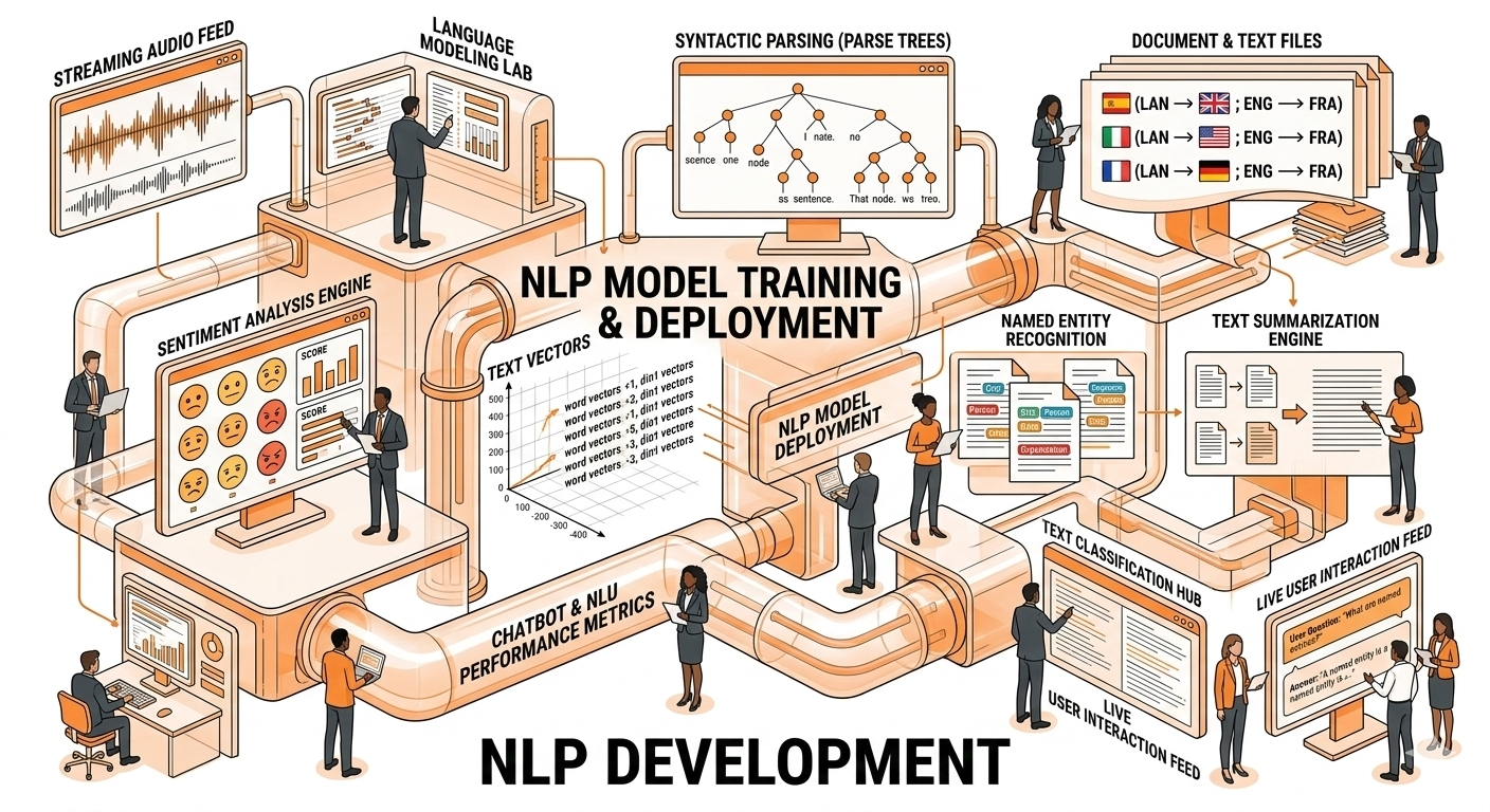NLP development is the process of designing, building, and deploying AI systems that enable computers to understand, interpret, and generate human language. It encompasses technologies like sentiment analysis, entity recognition, machine translation, chatbots, speech recognition, and document automation, allowing businesses to extract intelligence and automate language-driven processes at scale.